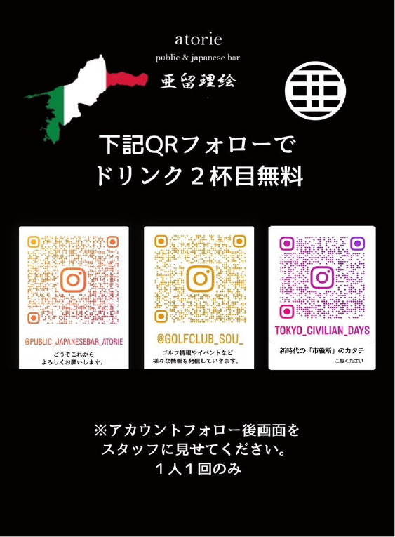 たかのこのホテル パブリック&ジャパニーズバール 亜留理絵 開店のお知らせ Posted on 2025年10月29日 By たかのこのホテル いつもたかのこのホテル、たかのこの湯をご利用いただき誠にありがとうございます。 この度同じオオノアソシエーツグループの「ゴルフクラブそう」に新たに「パブリック&ジャパニーズバール 亜留理絵」が開店しました。 ゴルフ前後はもちろん、ゴルフのプレーをしない方でも是非足を運んでください! 今なら写真内のQRコードのInstagramをフォローでドリンク2杯目が無料になります。